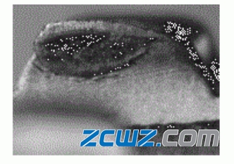 某型圆柱滚子轴承外形尺寸为φ74 mm x φ37mm x9 mm,锁爪位于保持架外径面,单耳结构。轴承转速为39200r/min,径向载荷为400N,属于高速轻载运转,该轴承使用过程中陆续发生了保持架锁爪断裂故障,断裂的锁爪均位于兜孔的同一侧,且断裂部位均为锁爪顶端,形貌如图5所示:
