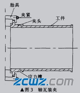 2)如必须采用径向夹紧工件时,为减少夹紧变形,应增加卡爪数量,增大接触面积。必要时也可增设辅助支撑。