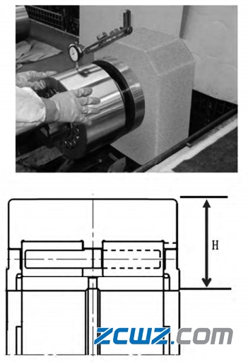 1) 根据 H 值高度进行分组,在每根心轴上,将装配后尺寸大的轴承放在中间,小的放在两边,由中间向两端依次递减,即轴承的排列顺序为中间高两边低。相邻背衬轴承 H 值误差控制在 0. 002mm 以内,整组控制在 0. 006mm( 图 1) 。H 值误差过大,会导致轧制过程中该列支承辊的各个衬背轴承受力严重不均,出现振动并导致滚柱疲劳损伤,影响产品质量,降低背衬轴承工作寿命。
