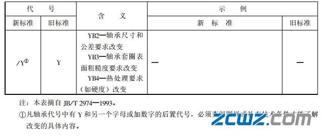 保持架结构型式及表面处理 | H W R E D D1 D2 C A B P | -- -- -- -- -- -- -- Y -- -- -- | 自锁兜孔保持架 焊接保持架 铆接保持架(用于大型轴承) 磷化处理保持架 碳氮共渗保持架 渗碳保持架 渗氮保持架 有镀层的保持架(C1————镀银) 外圈引导 内圈引导 由内圈或外圈引导的拉孔或冲孔的窗形保持架