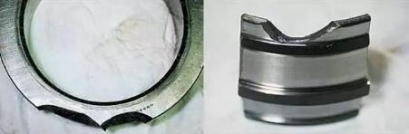 沟道单侧极限位置剥落主要表现在沟道与挡边交界处有严重的剥落环带。产生原因是轴承安装不到位或运转过程中突发轴向过载。