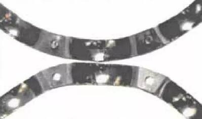 对称位置剥落表现在内圈为周围环带剥落,而外圈呈周向对称位置剥落(即椭圆的短轴方向),原因主要是因为外壳孔椭圆过大或两半分离式外壳孔结构,这在摩托车用凸轮轴轴承中表现尤为明显。当轴承压入椭圆偏大的外壳孔中或两半分离式外壳固紧时,轴承外圈产生椭圆,在短轴方向的游隙明显减少甚至负游隙。轴承在载荷的作用下,内圈旋转产生周向剥落痕迹,外圈只在短轴方向的对称位置产生剥落痕迹。这是该轴承早期失效的主要原因,经对该轴承失效件检验表明,该轴承外径圆度已从原工艺控制的0.8um变为27um。此值远远大于径向游隙值。因此,可以肯定该轴承是在严重变形及负游隙下工作的,工作面上易早期形成异常的急剧磨损与剥落。